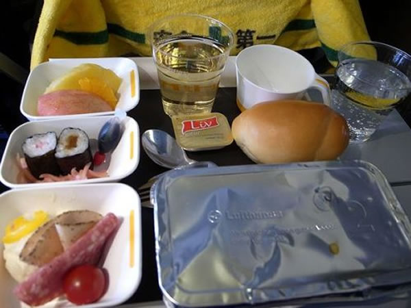 1回目は、フランクフルト積込みの和食ですが、そこそこ美味しかったという感想。ギャレーにスナック、バナナ、ジュースがセルフサービスで用意されています。到着の2時間前、2回目の機内食。洋食はスクランブルエッグなどの朝食メニューです。
