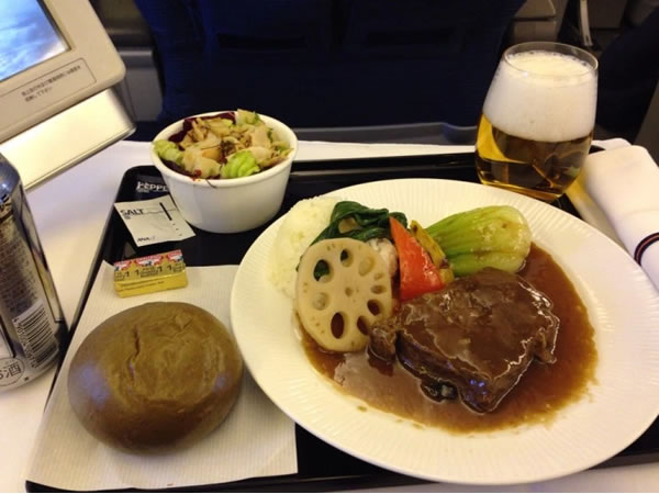 美味しいシチューやパン、サラダのホットミール機内食。
